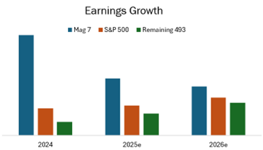 Excluding the Mag 7, the rest of the market trades below 20x earnings, yet offers lower expected growth rates. While there a many compelling opportunities outside the top tier, the stock market will likely share the fate of these magnificent corporations. As long as they can sustain robust and resilient earnings growth, investors will likely continue to pay premium valuations.