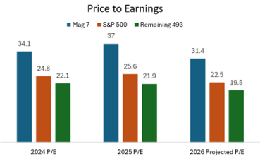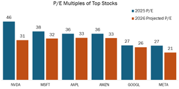 These large U.S. tech companies and others affiliated with the roll out of AI infrastructure and services, trade at relatively high price-to-earnings ratios. Microsoft, Apple, Nvidia, and Amazon all trade around 32x expected 2026 earnings, while Alphabet trades at 26x. Meta trades cheapest of the group, priced at only 21x earnings, based on investors' concerns that the company's spending spree will not yield a suitable return on investment. While these valuations are elevated relative to historical averages, they are a reflection of the corporations' quality, scale, innovation, and leadership. We believe their consistent earnings growth, strong balance sheets, and strategic positioning in transformative technologies justifies their premium valuations. Of the Mag 7, only Tesla trades at a cult-like valuation of 212x earnings.